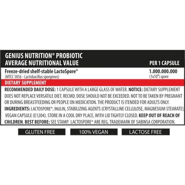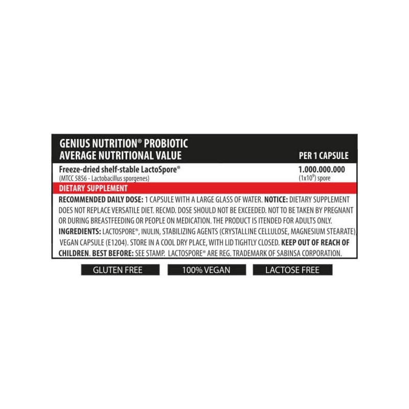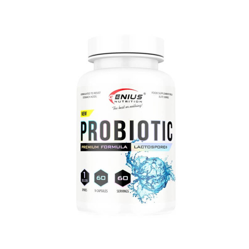 Probiotic від європейського бренду Genius Nutrition – біоактивна добавка класу пробіотиків, активними інгредієнтами, у складі якої є суперечки лактобактерій. Вони отримані з натуральної високоочищеної сировини і укладені в невеликі, зручні прийому капсули з желатинової оболонкою. Ці капсули легко проковтують і безперешкодно проходять стравоходом, а оболонка розчиняється в кишечнику, забезпечуючи максимальну ефективність корисних речовин.