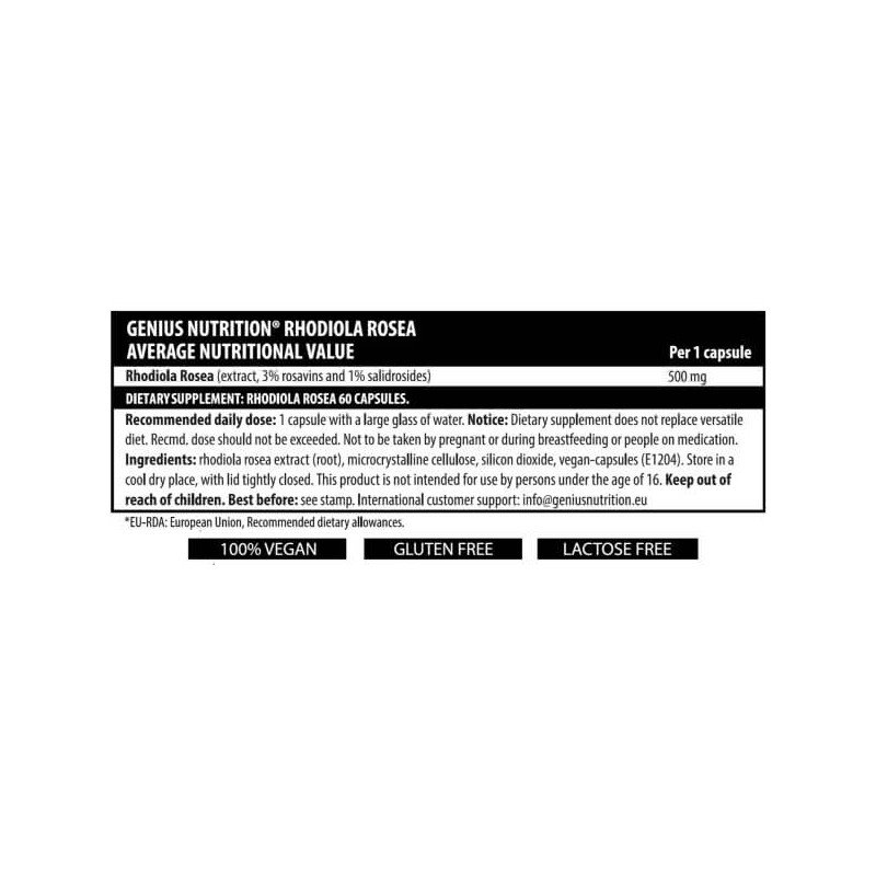 Rhodiola Rosea від шведської компанії Genius Nutrition – природна біодобавка, одержувана шляхом екстрагування кореневищ рослини родіоли рожевої (арктичного або золотого кореня), відомого своїми потужними адаптогенними властивостями. Сировину для її виготовлення збирають у екологічно благонадійних місцевостях, очищають та адаптують під вимоги міжнародних стандартів. А отриманий в результаті обробки екстракт укладають у невеликі, комфортні у ковтанні желатинові капсули. Ці капсули доставляють активну речовину в незмінному вигляді до кишечника, де вона висмоктується стінками і таким чином потрапляє в кров.