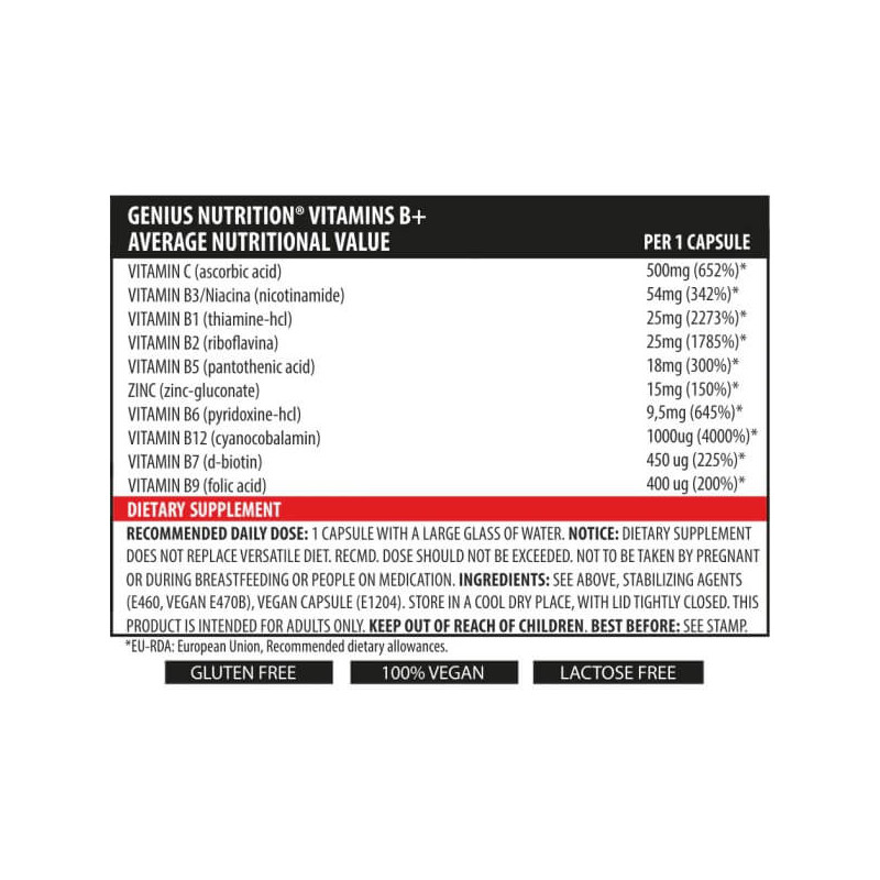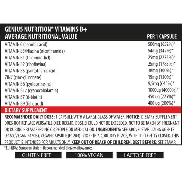 До складу кожної капсули Vitamins B+ від Genius Nutrition входить: