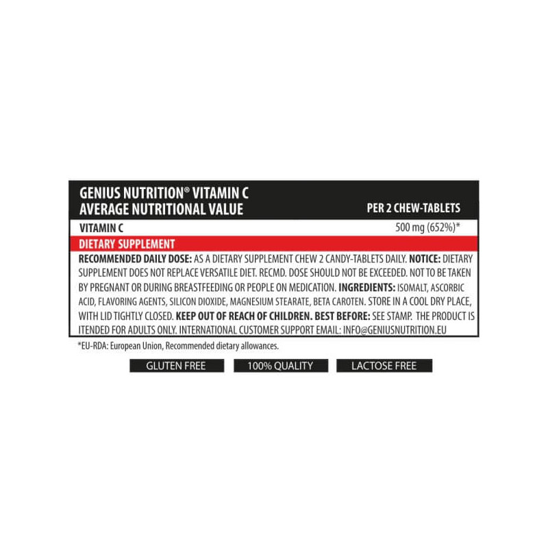 Приймають Vitamin C від Genius Nutrition від 1 до 4 цукерок на день, по 1 пастилці за раз після їжі. При застуді чи інфекції добову дозу можна збільшити до 6-10 цукерок.