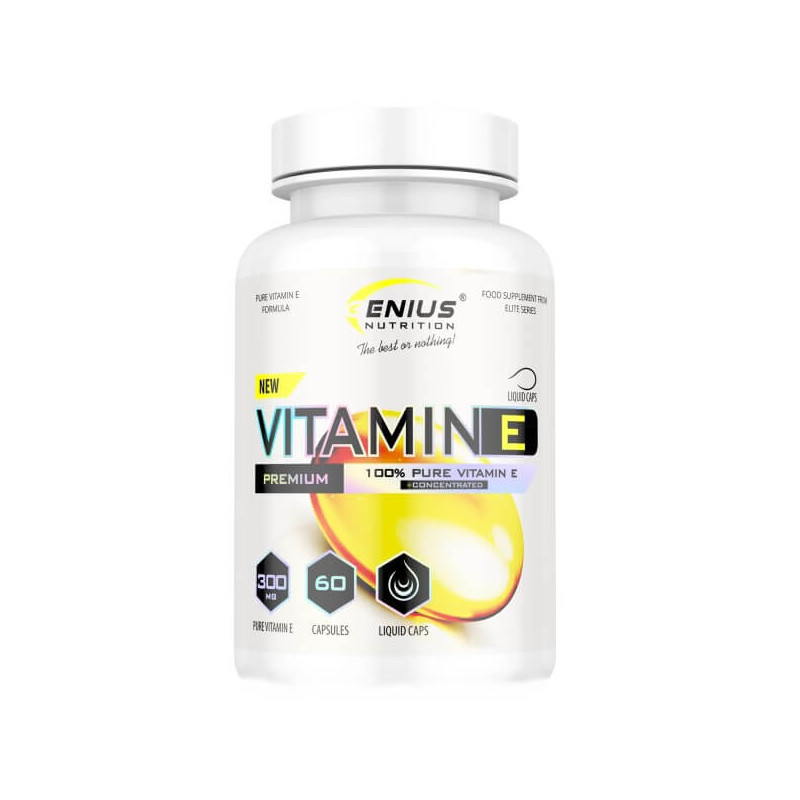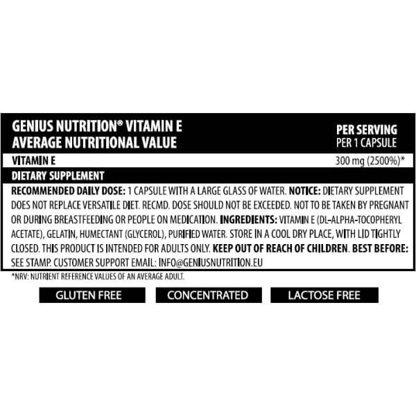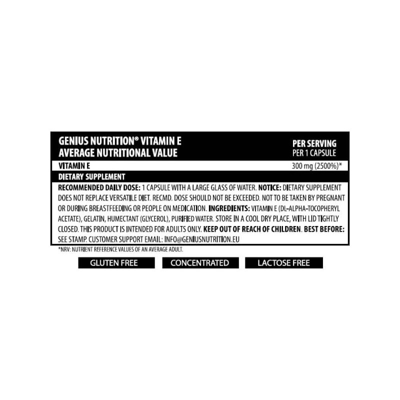 Vitamin E – вітамінна біодобавка від популярного бренду Genius Nutrition, активним інгредієнтом у складі якої є чистий адаптований вітамін Е. Він отриманий із натуральної сертифікованої рослинної сировини, яку збирають в екологічно благонадійних місцевостях, та пропонується споживачеві у зручній формі рідких капсул. Завдяки ідеально гладкій оболонці та невеликому розміру ці капсули легко ковтаються та безперешкодно проходять стравоходом. Вони не дратують стінки шлунка і швидко розчиняються в кишечнику, забезпечуючи повноцінне вивільнення та засвоєння нутрієнта.