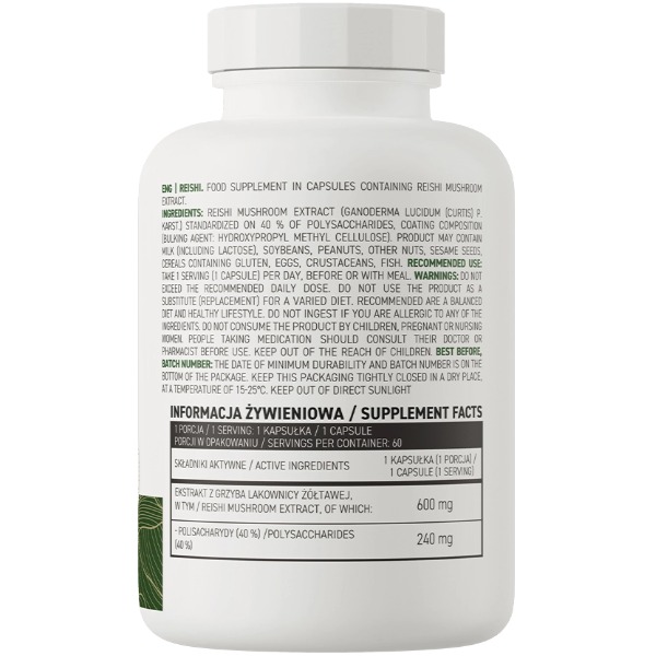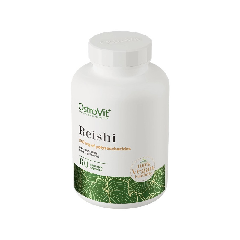 Reishi VEGE від OstroVit-цей продукт складається з якісних капсул, що містять екстракт гриба рейші, який у традиційній медицині східних країн давно цінується за свої цілющі властивості. У складі даного засобу відсутні штучні добавки та генетично модифіковані інгредієнти, що робить його ідеальним вибором для тих, хто цінує натуральні продукти та турбується про своє здоров'я.