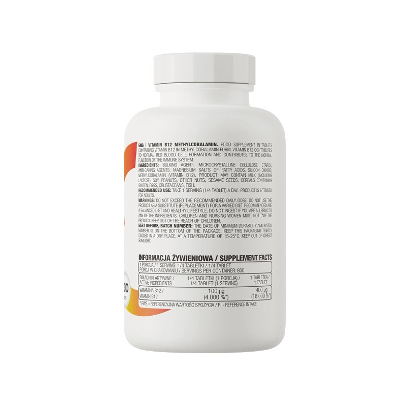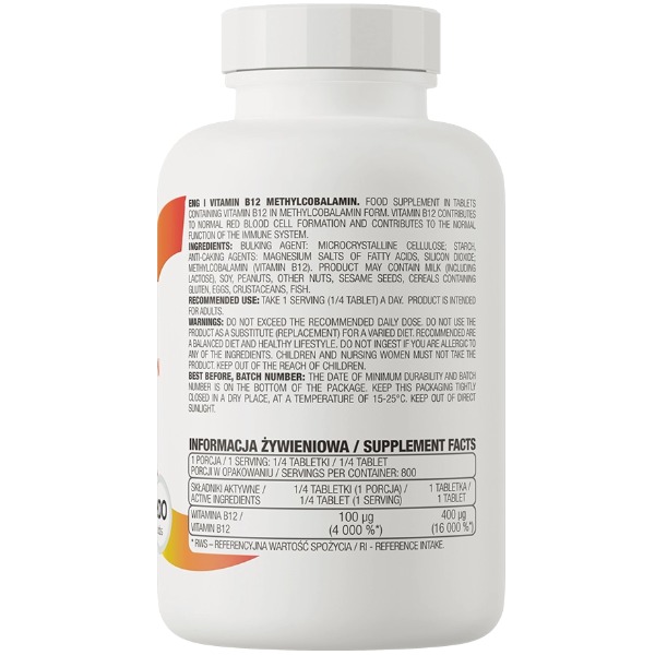 200 таблеток у флаконі: Зручна упаковка містить 200 таблеток, що забезпечує вас тривалим запасом вітаміну B12 та дозволяє економити час та кошти на постійних покупках.