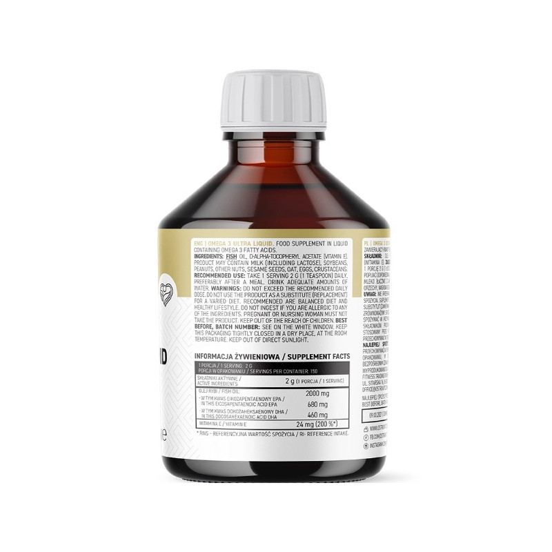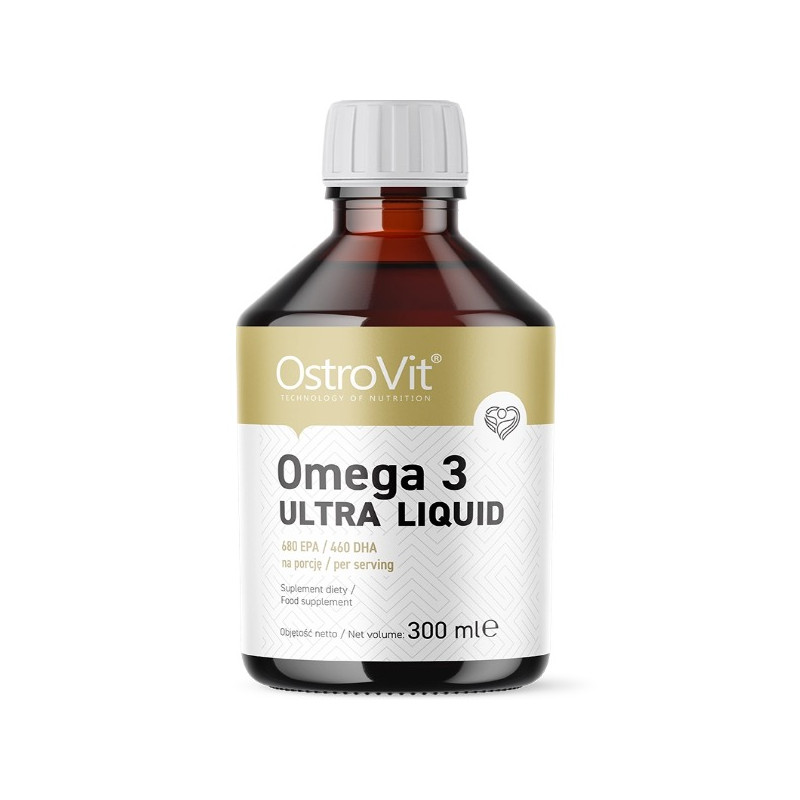 OstroVit Omega 3 Ultra Liquid містить етиловий концентрат риб'ячого жиру, збагачений ейкозапентаєновою кислотою (EPA) та докозагексаєновою кислотою (DHA). Ці жирні кислоти відомі своїми численними перевагами для здоров'я людини. Кожна порція OstroVit Omega 3 Ultra Liquid забезпечує оптимальне поєднання EPA і DHA, необхідне для підтримки здоров'я серця, судин та мозку.