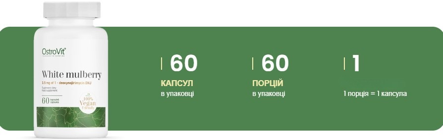 Капсульна форма: White Mulberry VEGE OstroVit представлений у зручній капсульній формі, що забезпечує легкість прийому і засвоєння. Капсули зручно приймати у будь-який час дня, що робить використання продукту максимально зручним і ефективним.