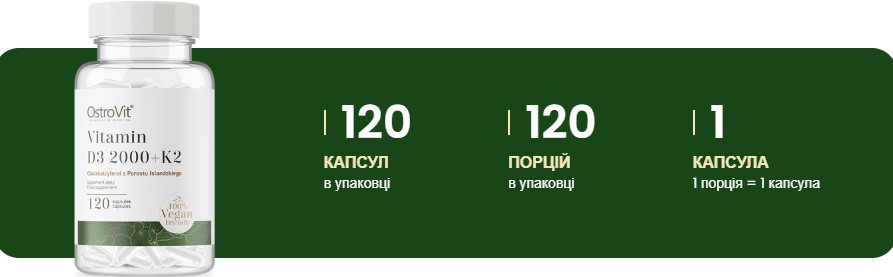 Познайомтеся з інноваційним рішенням для вашого здоров'я - OstroVit Vitamin D3 2000 + K2 Vegan. Цей продукт - це не просто добавка до вашого раціону, це ключ до підтримання вашого організму у чудовій формі в будь-яку пору року. Забезпечуючи оптимальний рівень вітамінів D3 і K2, ці капсули допоможуть вам почуватися сильними, енергійними і здоровими, навіть у найбільш непередбачувані періоди вашого життя.