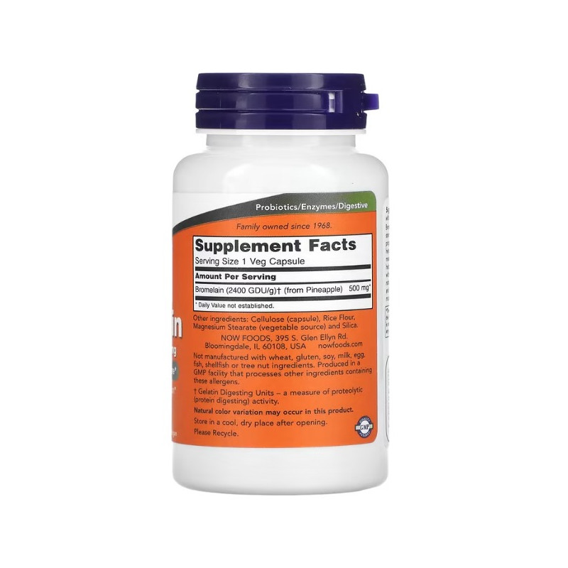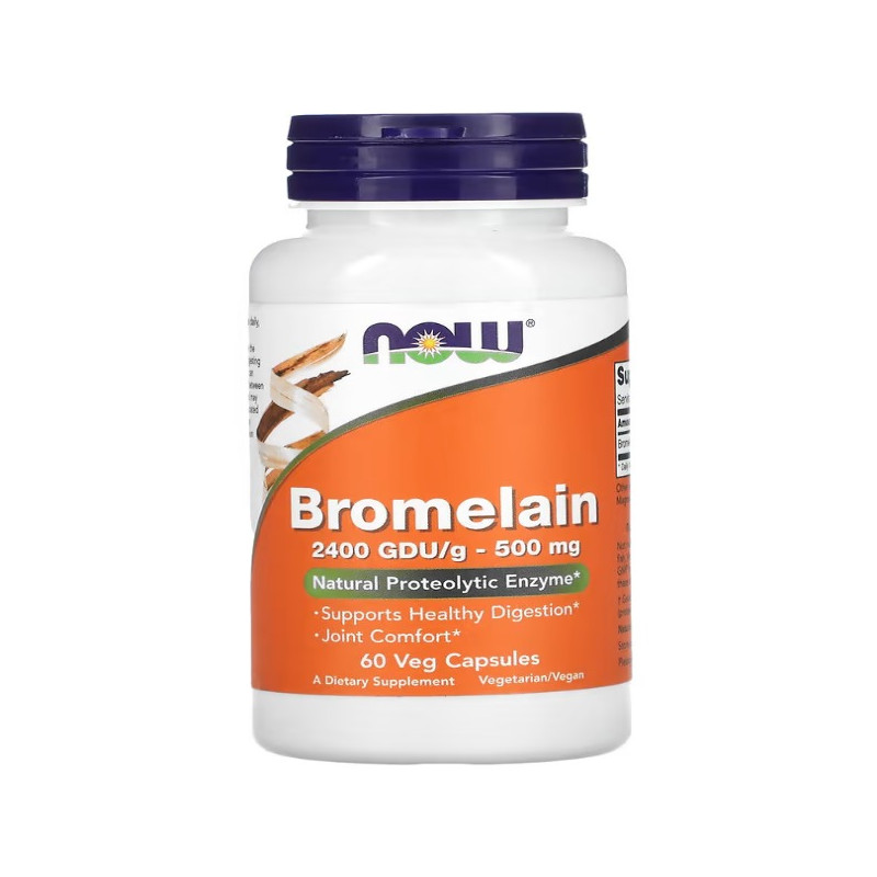 Bromelain - рослинна дієтична добавка від американської компанії NOW Foods, активним компонентом у складі якої є бромелайн. Він являє собою протеолітичний фермент, отриманий внаслідок специфічної обробки натуральної сировини - ядра, м'якоті шкірки та листя ананаса. Унікальні цілющі властивості цієї тропічної рослини відомі вже багато років. Сьогодні скористатися ними можна, не вводячи в щоденний раціон велику кількість ананаса, а просто купивши ефективну біодобавку з бромелайном від NOW Foods. Продукт представлений у капсульній формі - ідеальне рішення для людей, які не люблять специфічної текстури і нудотно-солодкого смаку ананасового м'якуша.