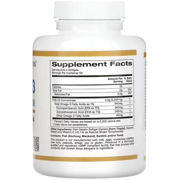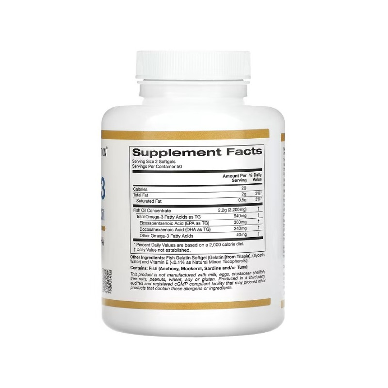 Omega-3 Premium Fish Oil California Gold Nutrition - це ідеальний вибір для тих, хто хоче забезпечити свій організм важливими жирними кислотами Омега-3 для підтримки здоров'я серця, мозку, очей та суглобів. Вживання цього продукту в поєднанні зі здоровим способом життя та харчуванням допоможе вам почувати себе краще і підтримувати своє здоров'я на високому рівні.