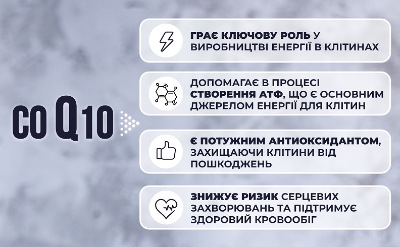 Енергетичний обмін: Беручи участь у виробленні АТФ (аденозинтрифосфату), CoQ10 забезпечує клітини енергією, що особливо важливо для активних людей та спортсменів.