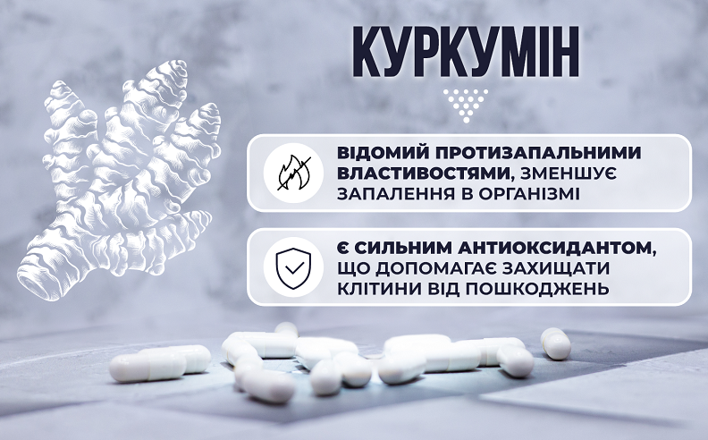 Куркумін — це активна речовина, що міститься в куркумі, яка володіє потужними протизапальними та антиоксидантними властивостями. Куркумін відомий своїми численними корисними властивостями і широко використовується в традиційній медицині для лікування різних захворювань.