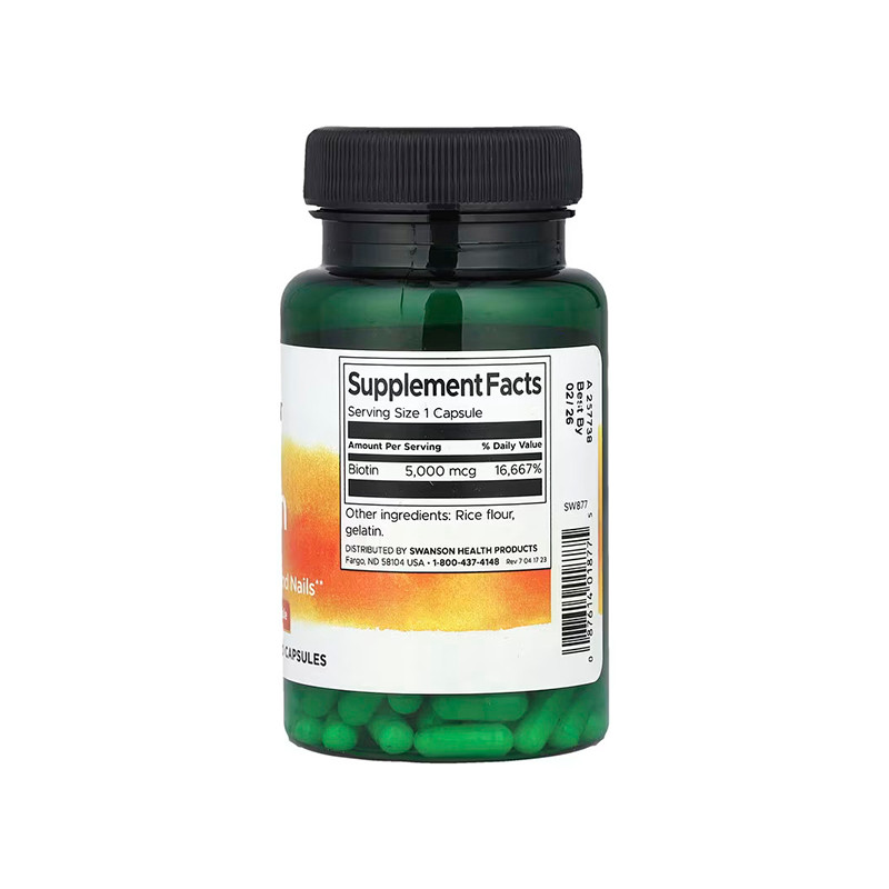 Biotin 5000 мкг від Swanson – це високоякісна добавка у зручній формі капсул, яка забезпечує ваш організм необхідною кількістю цього важливого вітаміну. Добавка допомагає зберегти здоровий вигляд волосся, шкіри та нігтів, а також підтримує обмін речовин на належному рівні.