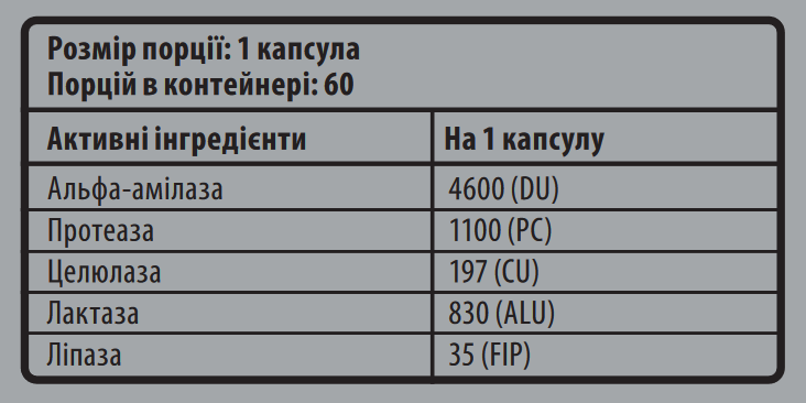 Інгредiєнти: альфа-амілаза (із суміші DigeZyme®), протеаза (із суміші DigeZyme®), целюлаза (із суміші DigeZyme®), лактаза (із суміші DigeZyme®), ліпаза (із суміші DigeZyme®).