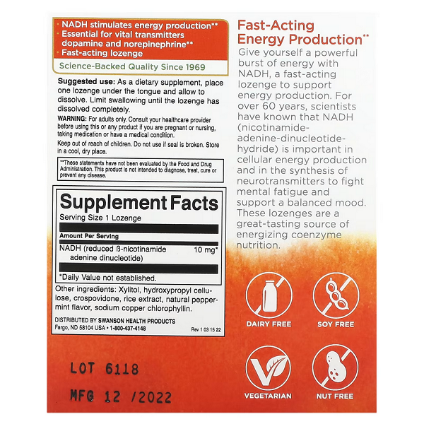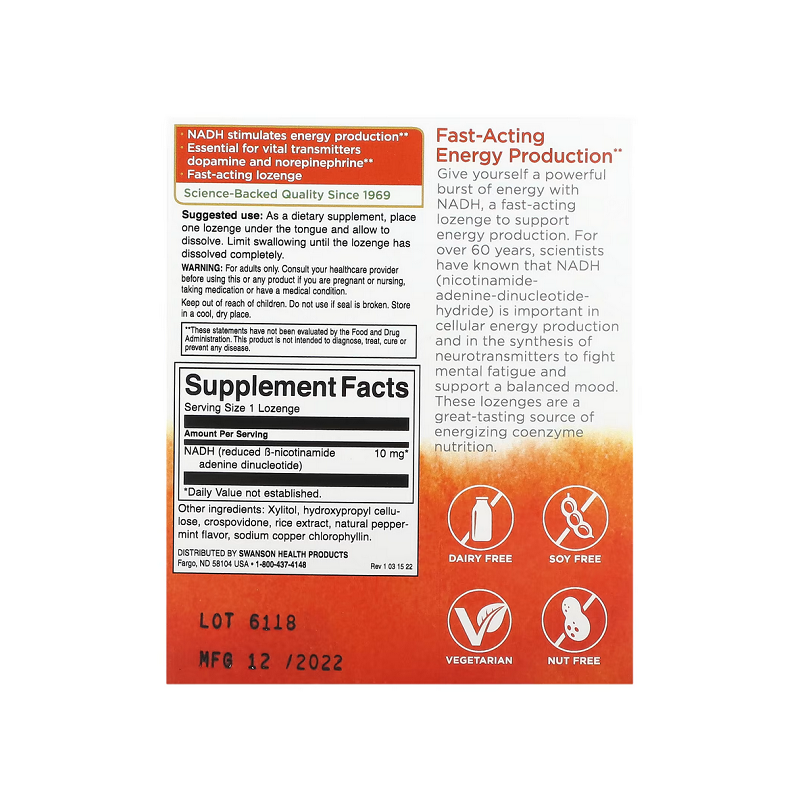 Swanson NADH 10 мг — добавка для підвищення енергії та підтримки розумової активності, що легко засвоюється завдяки зручній формі. Сприяє боротьбі з втомою та підтримує здоров'я клітин.