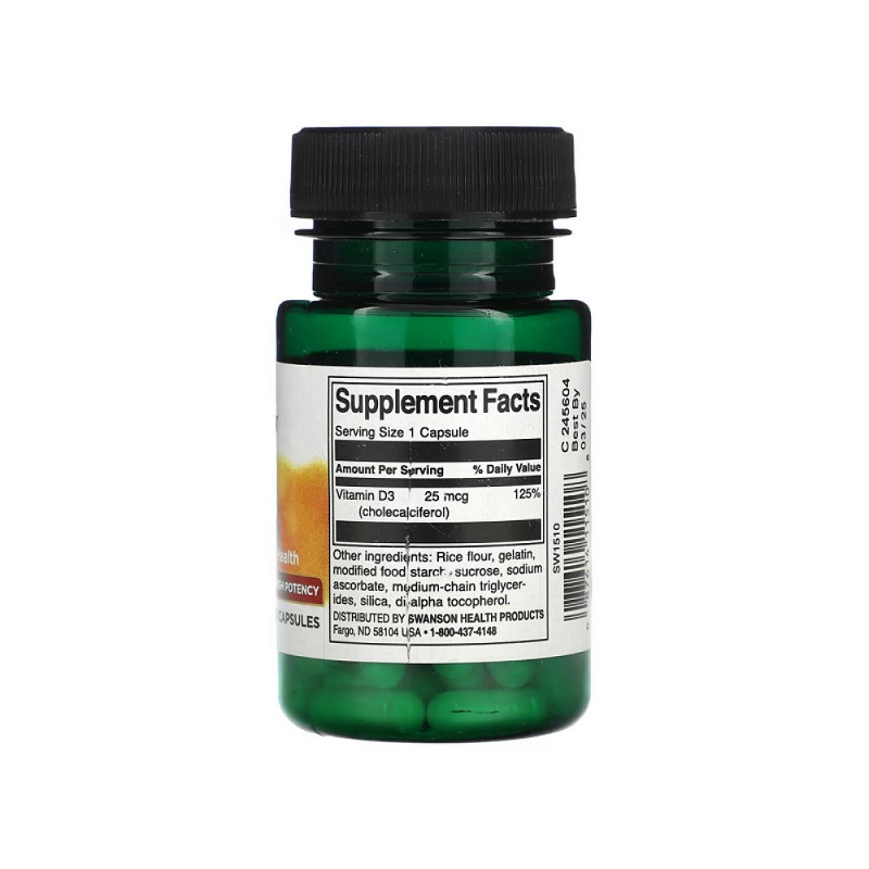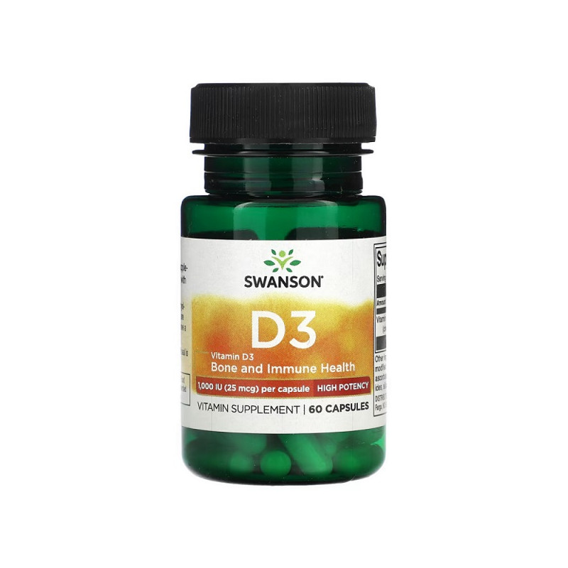 Vitamin D3 1,000 IU Swanson — це дієтична добавка, яка забезпечує 1,000 МО вітаміну D3 у кожній капсулі. Вітамін D3 підтримує здоров'я кісток, зміцнює імунну систему та допомагає в засвоєнні кальцію. Ця добавка є ідеальним вибором для тих, хто прагне поліпшити своє загальне самопочуття та енергійність.