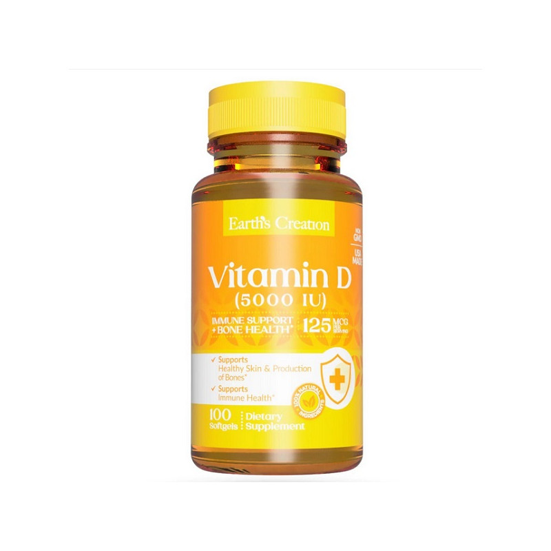 Vitamin D 5000 IU від Earth‘s Creation допомагає зберігати здоров'я кісток і підтримувати імунітет навіть у періоди дефіциту сонячного світла. Продукт забезпечує високу концентрацію активного вітаміну D3 для максимальної ефективності. Ідеальний вибір для активного способу життя і підтримки енергії кожного дня.