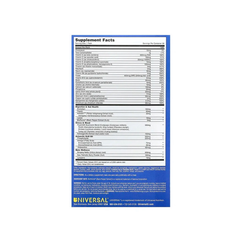 Men's Total Health Pack Universal Nutrition – це зручний комплекс для повноцінної підтримки чоловічого організму. Продукт сприяє підвищенню витривалості, покращує концентрацію та знижує рівень стресу. Його формула ідеально підходить для активного способу життя та підтримки фізичної форми. Пакетний формат забезпечує простоту використання в будь-яких умовах.