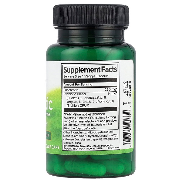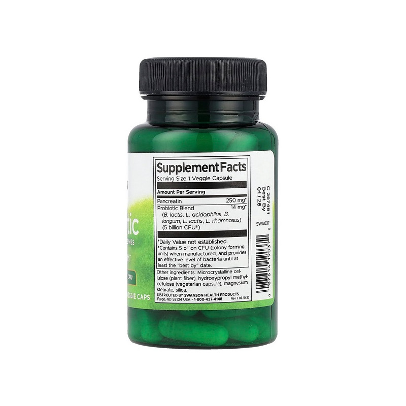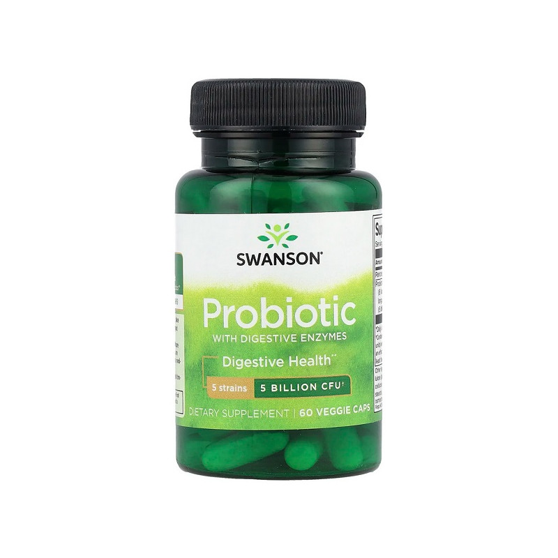 Probiotic with Digestive Enzymes 5 Billion CFU Swanson поєднує потужний комплекс пробіотиків та травних ферментів для підтримки здоров'я кишечника. Ця добавка допомагає полегшити травлення та покращити засвоєння поживних речовин. Вона оптимізує баланс корисних бактерій та знижує ризик дискомфорту після їжі. Ідеально підходить для щоденного використання та забезпечує загальне зміцнення організму.
