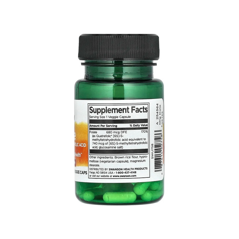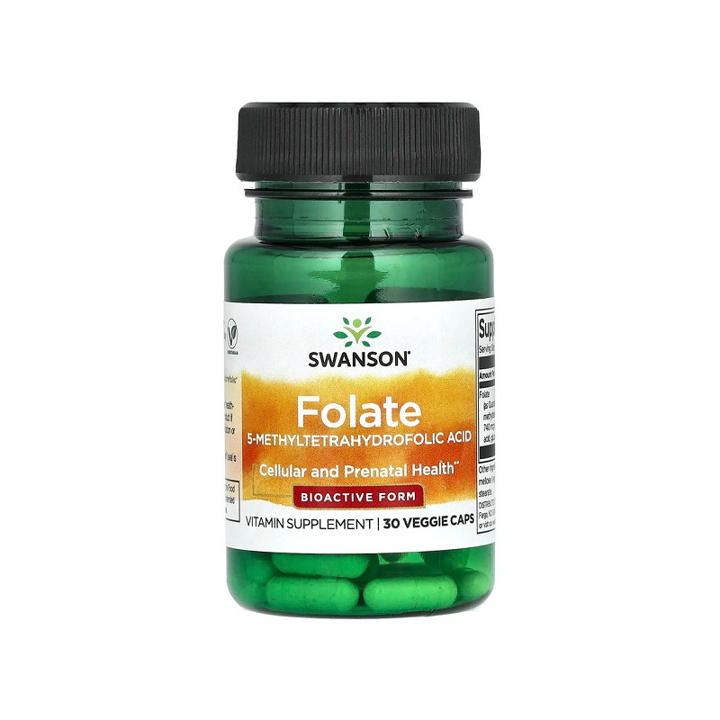 Folate 5-Methyltetrahydrofolic Acid 680мкг Swanson — це високоефективний препарат для підтримки здоров'я серця та нервової системи. Він забезпечує оптимальний рівень фолієвої кислоти, важливої для вагітних жінок та нормального розвитку плода. Продукт має підвищену біодоступність завдяки використанню 5-MTHF, що забезпечує швидке засвоєння. Вегетаріанські капсули гарантують безпеку та ефективність для тих, хто дотримується рослинної дієти.