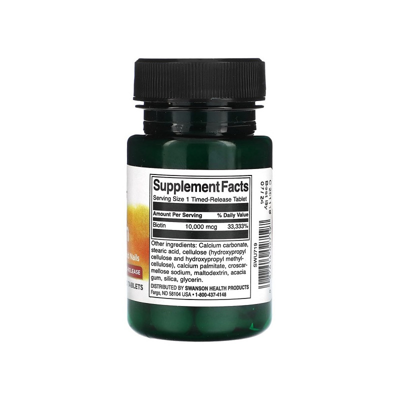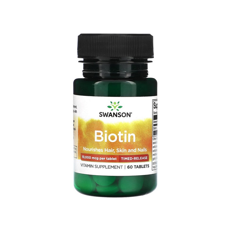 Biotin 10,000мкг Time-Release Swanson – потужна добавка для зміцнення волосся, шкіри та нігтів. Завдяки поступовому вивільненню біотину, вона забезпечує тривале і ефективне засвоєння. Продукт допомагає покращити вигляд волосся, запобігаючи їх випаданню. Ідеальний вибір для тих, хто хоче відновити здоров’я та міцність волосся і нігтів.