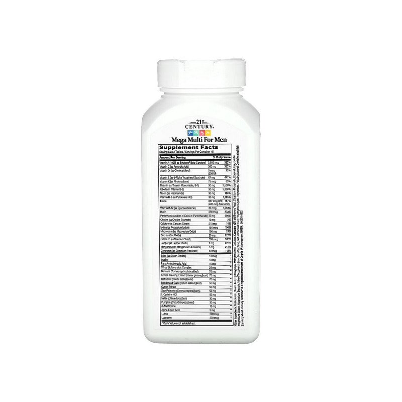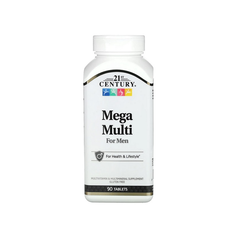 Mega Multi for Men 21st Century – це потужний комплекс вітамінів і мінералів, спеціально розроблений для чоловіків. Він підтримує енергію, витривалість і загальний тонус організму. Продукт допомагає зміцнити імунну систему, покращує функцію серцево-судинної системи та здоров’я простати. Вітаміни групи B та антиоксиданти сприяють поліпшенню фізичної активності та відновлення після навантажень. Регулярне використання цього комплексу підтримує чоловіче здоров’я та забезпечує необхідні поживні речовини на кожен день.