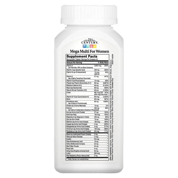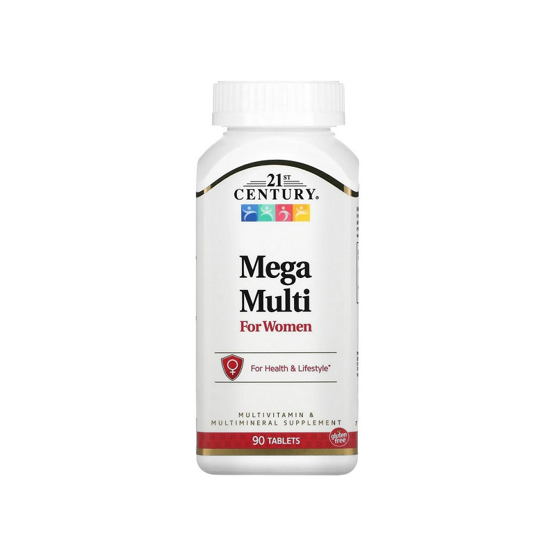 Mega Multi for Women 21st Century забезпечує жінок важливими вітамінами та мінералами для підтримки енергії та здоров'я. Продукт покращує стан шкіри, волосся і нігтів завдяки біотину та антиоксидантам. Формула підтримує здоров'я кісток, покращує імунітет і сприяє гармонії гормонів. Це ідеальний вибір для жінок, які хочуть зберегти молодість і здоров'я. Регулярне використання допомагає зберігати баланс та витривалість на протязі всього дня.