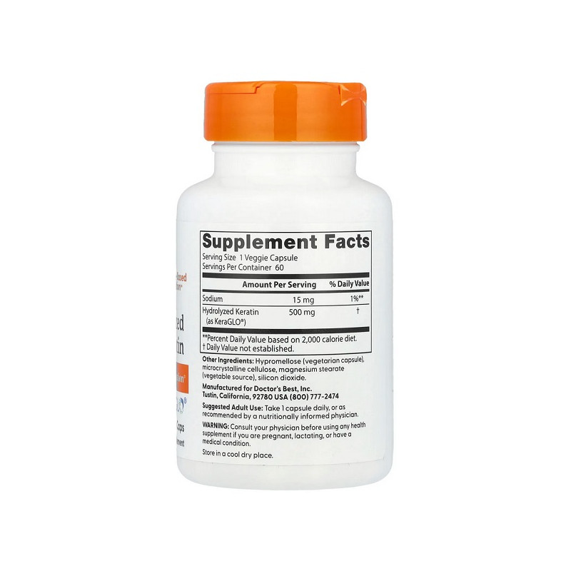 Hydrolyzed Keratin від Doctor's Best – це добавка для зміцнення волосся, нігтів та шкіри, яка активно відновлює їх структуру. Гідролізований кератин швидко засвоюється організмом, покращуючи стан волосся та запобігаючи його випадінню. Продукт також зміцнює нігті, запобігаючи їх ламкості та розшаруванню. Використання цієї добавки допомагає досягти здорової та еластичної шкіри. Це ідеальний вибір для тих, хто хоче підтримувати природну красу та здоров'я волосся і нігтів.