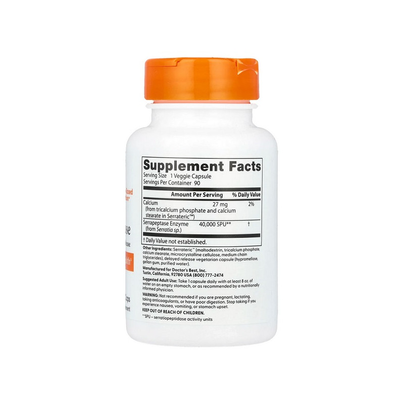 Serrapeptase 40000 SPU Doctor's Best – це високоякісна добавка, що ефективно підтримує здоров'я суглобів, дихальних шляхів та покращує загальний стан організму завдяки своїм потужним протизапальним властивостям.