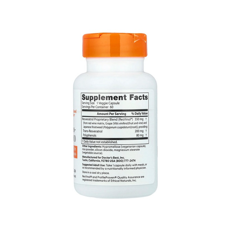 Trans-Resveratrol with ResVinol 200мг Doctor's Best — це ефективний антиоксидант, який підтримує здоров'я серцево-судинної системи, покращує кровообіг, знижує запальні процеси в організмі і сприяє загальному здоров'ю завдяки своїм потужним захисним властивостям.