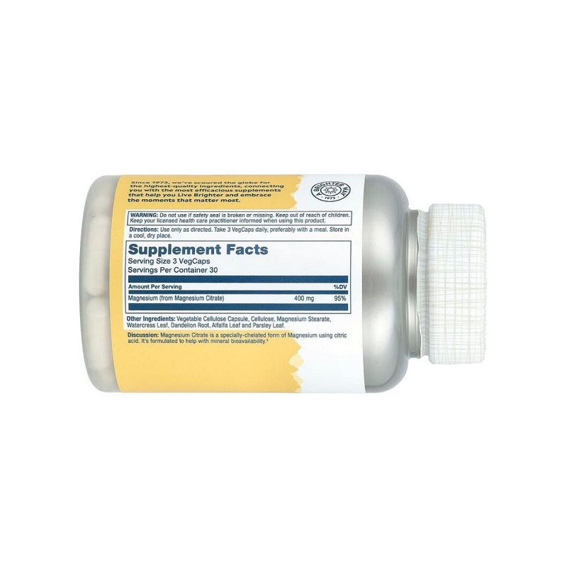 Magnesium Citrate 400мг від Solaray — це зручне рішення для щоденної підтримки організму. Ця форма магнію має високу біодоступність і легко засвоюється. Продукт особливо підходить для людей, які відчувають дефіцит магнію через стрес, дієти або фізичне навантаження. Його зручно приймати в капсулах, не викликає подразнення шлунка. Добавка виготовлена без штучних барвників, підсолоджувачів і консервантів.
