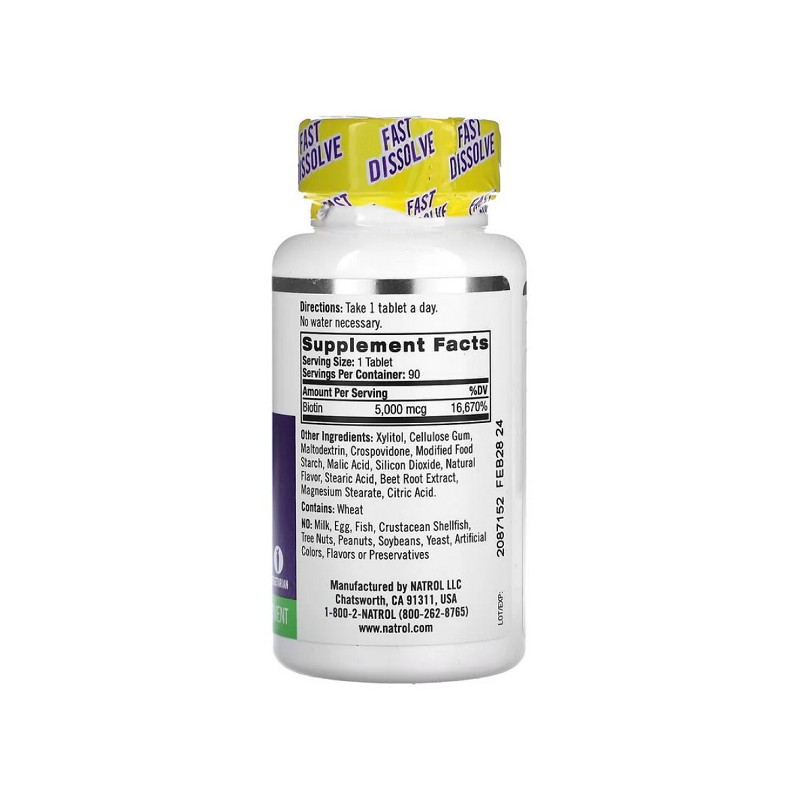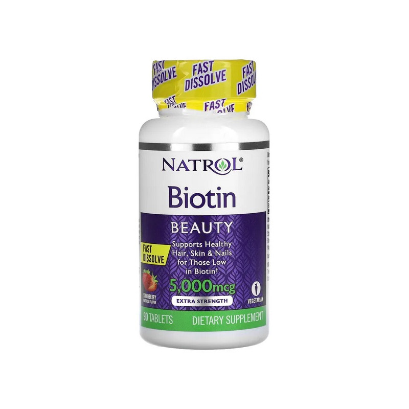 Високоефективна харчова добавка, що забезпечує інтенсивну підтримку краси та здоров’я зсередини завдяки підвищеній дозі біотину. Біотин (вітамін B7), відомий як «вітамін краси», відіграє ключову роль у збереженні здоров’я шкіри, волосся та нігтів, а також бере участь у нормальному метаболізмі жирів, білків і вуглеводів. Формула Extra Strength із 5000 мкг біотину в одній таблетці розроблена для максимального результату та тривалої дії. Продукт ідеально підходить для людей, які мають ламке волосся, слабкі нігті або проблемну шкіру, а також для підтримки енергетичного обміну під час дієт або фізичних навантажень. Завдяки високій якості Natrol, добавка швидко засвоюється та є безпечною для щоденного застосування.