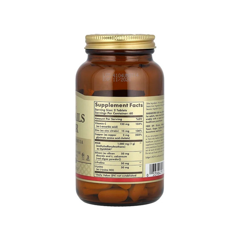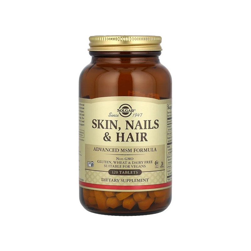 Посилена формула краси, розроблена для зміцнення структури шкіри, волосся та нігтів зсередини. До складу входять важливі поживні речовини, серед яких метилсульфонілметан (MSM) — джерело органічної сірки, а також вітамін C, цинк, мідь та амінокислоти. Ці інгредієнти беруть участь у синтезі колагену, кератину та еластину — ключових структурних білків для підтримки здоров’я шкірного покриву, волосся та нігтьових пластин. Формула також забезпечує антиоксидантний захист, сприяє загоєнню шкіри та підтримує клітинне оновлення. Продукт не містить глютену, пшениці, молочних компонентів та виготовлений відповідно до найвищих стандартів якості Solgar.
