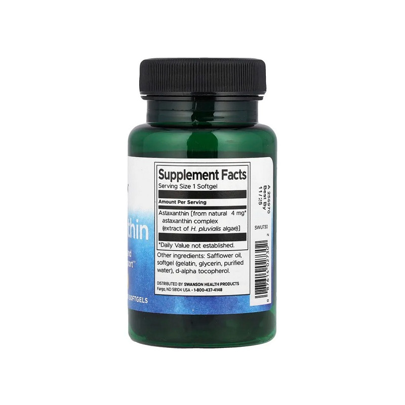 Astaxanthin Swanson 4мг – це природна формула для захисту клітин, збереження молодості шкіри, підтримки зору, серця та витривалості в сучасному ритмі життя.