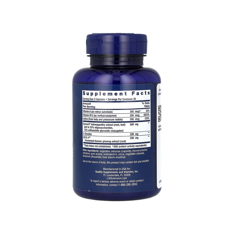 Thyroid Support Complex Life Extension допомагає забезпечити оптимальну роботу щитоподібної залози. Комплекс поєднує вітаміни, мінерали та рослинні екстракти. Йод і селен підтримують вироблення тиреоїдних гормонів. Ашваганда і гугул зміцнюють ендокринну систему та діють як адаптогени. Імбир покращує обмін речовин і тонус. Продукт сприяє зниженню втоми, зміцненню імунітету та підвищенню енергії. Формула підходить для щоденного прийому. Не містить глютену, ГМО та штучних барвників.