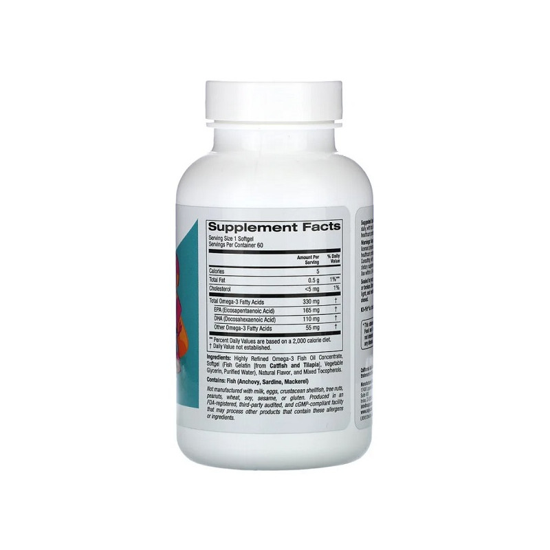 Високоякісна харчова добавка, створена спеціально для дітей. Продукт містить очищену риб’ячу олію з високим вмістом омега-3 жирних кислот — ейкозапентаєнової (EPA) та докозагексаєнової (DHA). Ці жирні кислоти надзвичайно важливі для розвитку мозку, нервової системи, зору та серцево-судинної системи. Формула розроблена у формі м’яких жувальних капсул зі смачною фруктовою оболонкою, що робить прийом приємним для дитини. Omega-3 Fish Oil пройшла молекулярну дистиляцію, що гарантує її чистоту від важких металів, ртуті та інших забруднювачів. Продукт не містить штучних барвників, ароматизаторів, глютену та сої. Підходить для щоденного використання як профілактика дефіциту омега-3. Рекомендований для дітей віком від 4 років.