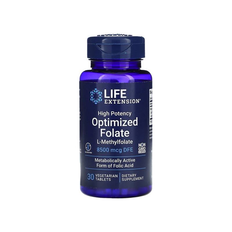 Високоефективна добавка для підтримки серцево-судинного здоров’я, мозкової діяльності та нормального кровотворення. High Potency Optimized Folate 8500 мкг Life Extension містить біоактивну форму фолієвої кислоти — L-5-метилтетрагідрофолат (L-5-MTHF), яка краще засвоюється організмом, ніж звичайна фолієва кислота. Ця форма фолату необхідна для синтезу ДНК, нормального поділу клітин, підтримки нервової системи та зниження рівня гомоцистеїну — важливого маркера здоров’я серця. Продукт рекомендований для дорослих, які прагнуть підтримати енергетичний обмін, когнітивну функцію та загальне самопочуття.