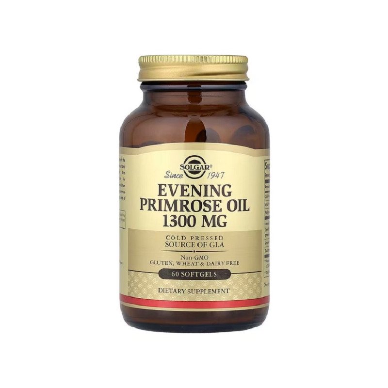 Solgar Evening Primrose Oil 1300мг — це натуральне джерело GLA, яке підтримує здоров’я шкіри, гормональний баланс і загальне самопочуття жінок. Допомагає зменшити прояви ПМС, покращує стан волосся та нігтів, сприяє зволоженню шкіри та підтримує імунну систему. Виготовлений за технологією холодного віджиму без хімічних добавок, продукт є безпечним і високоякісним джерелом омега-6 жирних кислот.