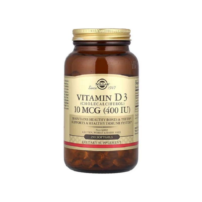 Vitamin D3 400 IU Solgar — це натуральний холекальциферол для щоденної підтримки здоров’я кісток і імунної системи. Він допомагає засвоювати кальцій і фосфор, зміцнюючи кістки та зуби. Вітамін D3 також підтримує м’язи та сприяє покращенню настрою. Продукт підходить для людей, які рідко отримують достатньо сонячного світла. Капсули легко ковтати та мають високу біодоступність. Формула допомагає підтримувати енергію і тонус протягом дня. Solgar гарантує найвищу якість і чистоту свого продукту. Не містить глютену, пшениці, дріжджів і штучних добавок. Це зручний спосіб щоденно дбати про своє здоров’я.