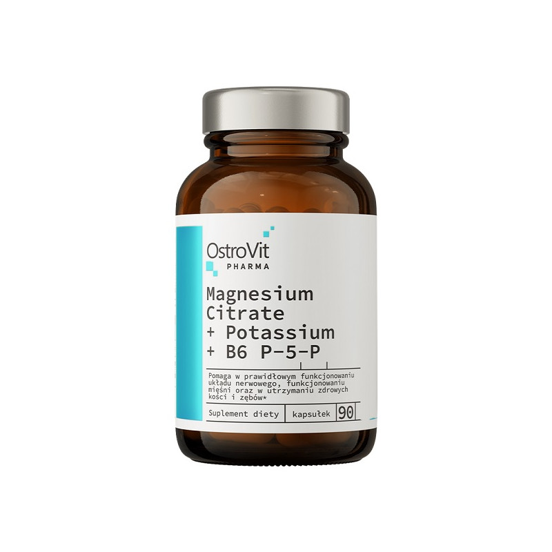 Pharma Magnesium Citrate + Potassium + B6 P-5-P OstroVit – капсули для підтримки нервової та м’язової системи. Допомагають зменшити втому. Підтримують серцево-судинну систему. Забезпечують електролітний баланс. Беруть участь у виробленні енергії. Зручні у щоденному прийомі. Оптимальний вибір для активних людей і спортсменів.