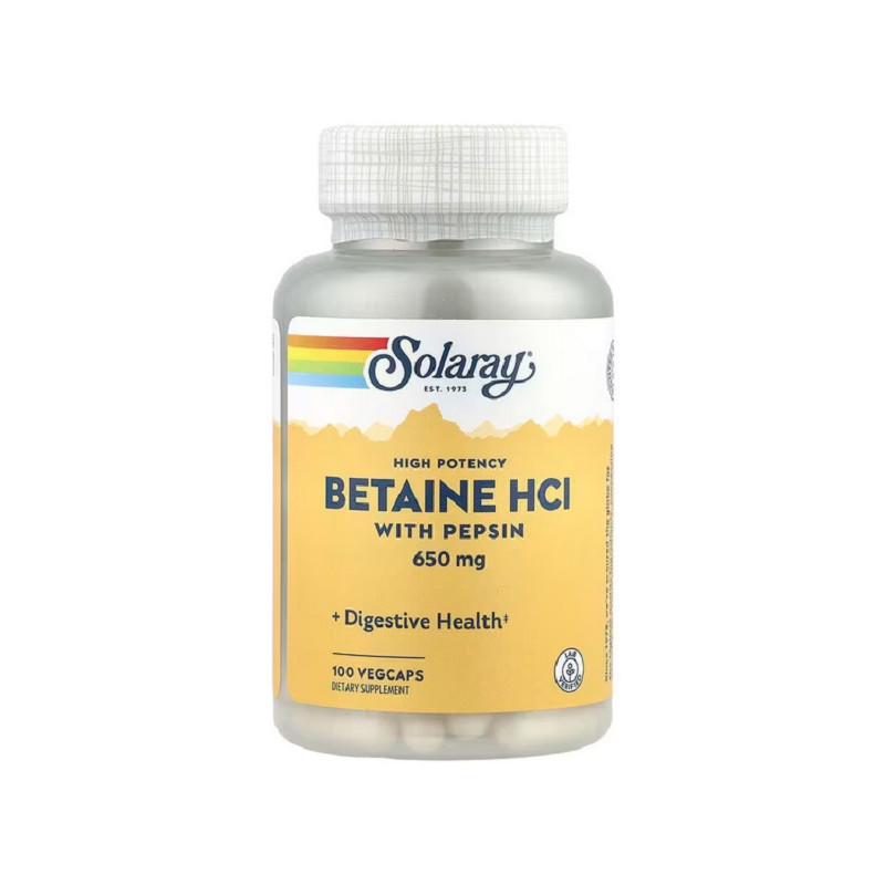 Betaine HCI with Pepsin 650мг Solaray - добавка для підтримки здорового травлення та роботи шлунка. Допомагає покращити розщеплення білків і засвоєння поживних речовин. Сприяє підвищенню кислотності шлункового соку. Зменшує відчуття важкості та здуття після їжі. Підходить для людей із зниженою кислотністю шлунка. Допомагає при високобілковому харчуванні. Підтримує комфорт травної системи щодня. Зручна форма капсул для регулярного прийому. Сприяє загальному покращенню процесів травлення.