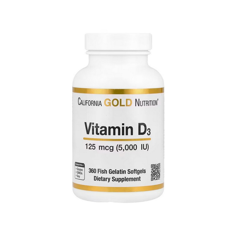 Функціональна добавка Vitamin D3 5000 IU California Gold Nutrition (360 капсул) створена для інтенсивної підтримки імунної системи, здоров’я кісток і нормального обміну речовин. Вітамін D3 (холекальциферол) є найбільш ефективною формою вітаміну D, яка сприяє кращому засвоєнню кальцію та фосфору в організмі. Підвищене дозування 5000 МО особливо актуальне при вираженому дефіциті вітаміну D або обмеженому перебуванні на сонці. Формула в олійній основі забезпечує високу біодоступність і ефективне засвоєння. Продукт підходить для дорослих, які потребують підвищеної підтримки імунітету та кісткової системи.