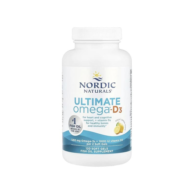 Високоякісна харчова добавка, яка поєднує потужну концентрацію омега-3 жирних кислот і вітаміну D3 для комплексної підтримки організму. Формула Ultimate Omega-D3 містить високі дози EPA та DHA у поєднанні з "сонячним вітаміном", що забезпечує синергічну дію для серцево-судинної системи, кісток, імунітету та загального самопочуття. Продукт створений для тих, хто прагне отримати максимальний ефект від щоденного прийому омега-3 з додатковою користю вітаміну D3.