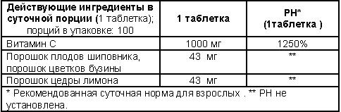 Склад препарату: вітамін С, наповнювач, барвник, антизлежувач, порошки плодів шипшини і бузини (2,5%), екстракт цедри лимона (2,5%).
