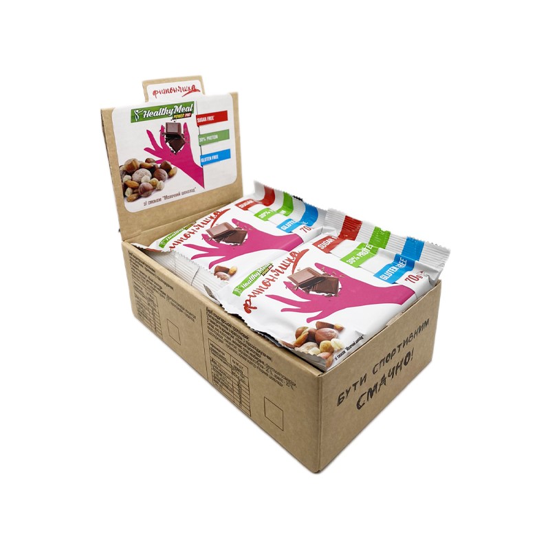 Склад шоколаду з фундуком: сироватковий протеїн (30%), 20% фундука, сухе молоко, кокосовий жир, сукролаза, фруктоолігосахаріди, ароматизатор.