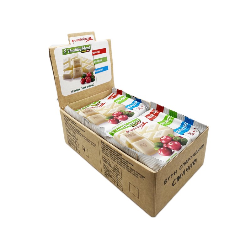 Склад шоколаду з журавлиною: сироватковий білок (20%), кокосовий жир, сухе молоко, сушена журавлина (3%), сукралоза, фруктоолігосахаріди.