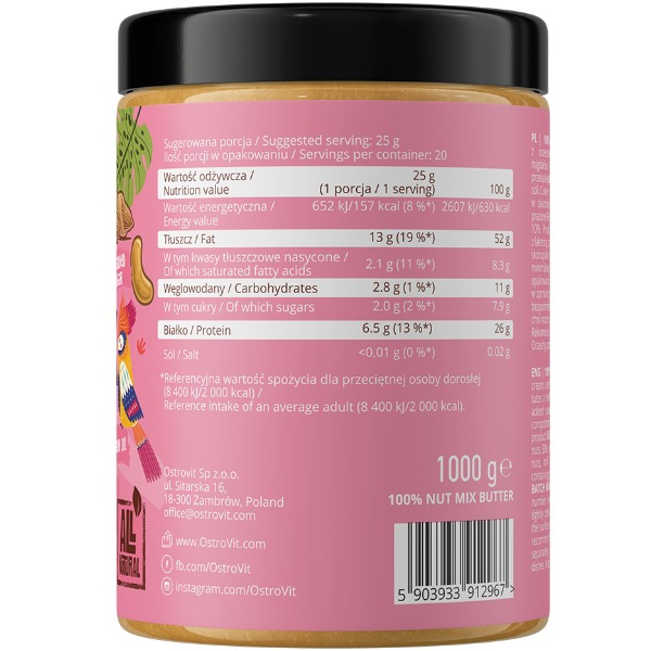 Горіхова паста 100% Nut Mix Butter від OstroVit - це витончений продукт, що поєднує у собі неперевершений смак різноманітних горіхів та переваги здорового харчування. Зроблена з вишуканого міксу горіхів без додавання будь-яких штучних компонентів, ця паста стане не тільки вишуканою добавкою до вашого раціону, але й цінним джерелом поживних речовин.