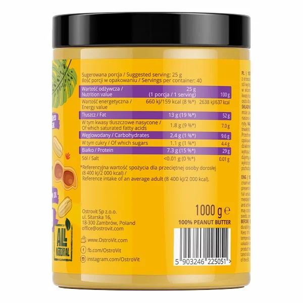 Арахісове масло OstroVit - це не тільки смачна добавка, але й вибір для тих, хто прагне зберегти баланс між смаком та здоров'ям. Відкрийте для себе новий рівень задоволення від їжі з цим винятковим арахісовим маслом від OstroVit!